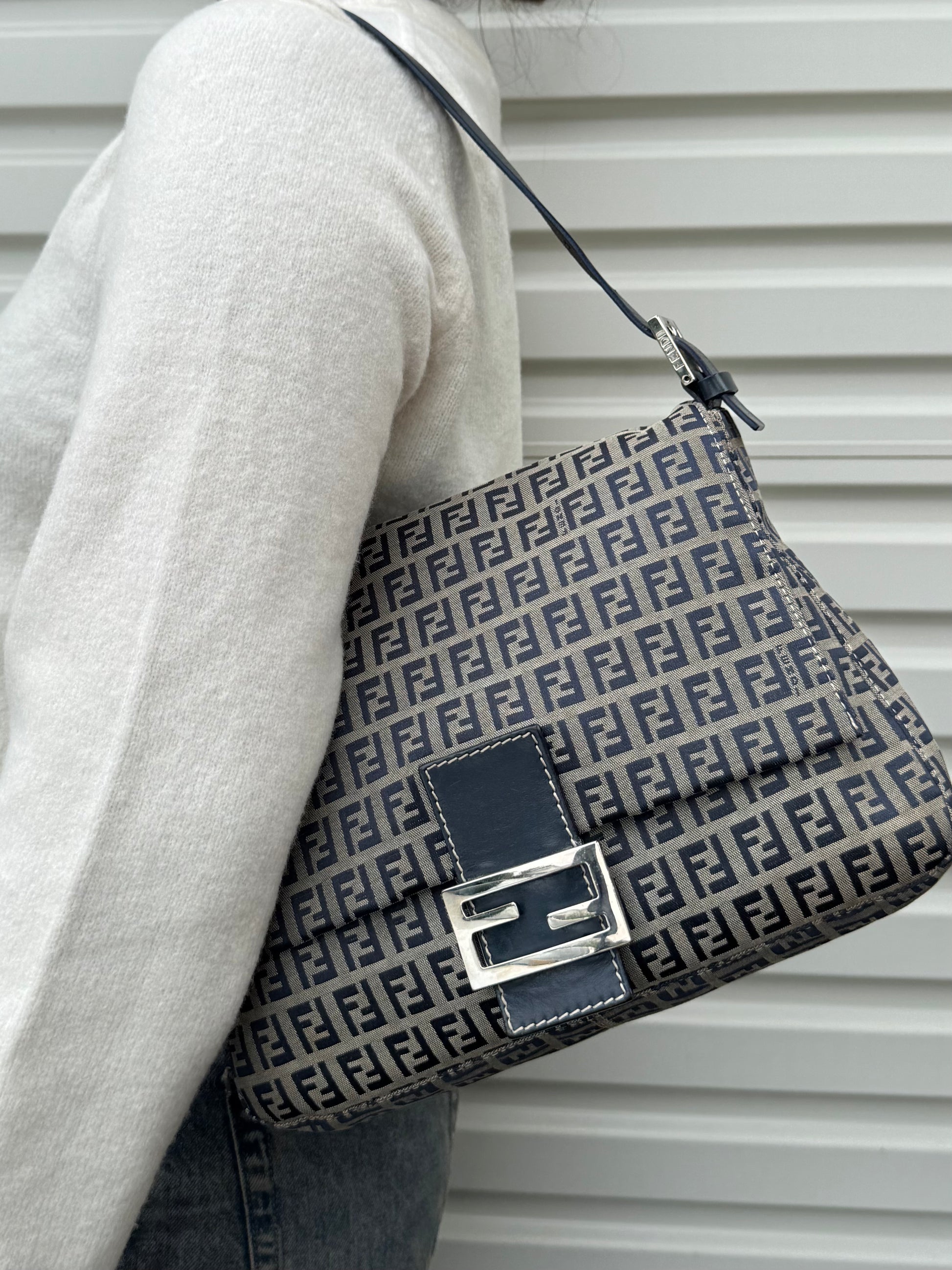 Material: Fendi zucchino print canvas, navy leather, silver hardware