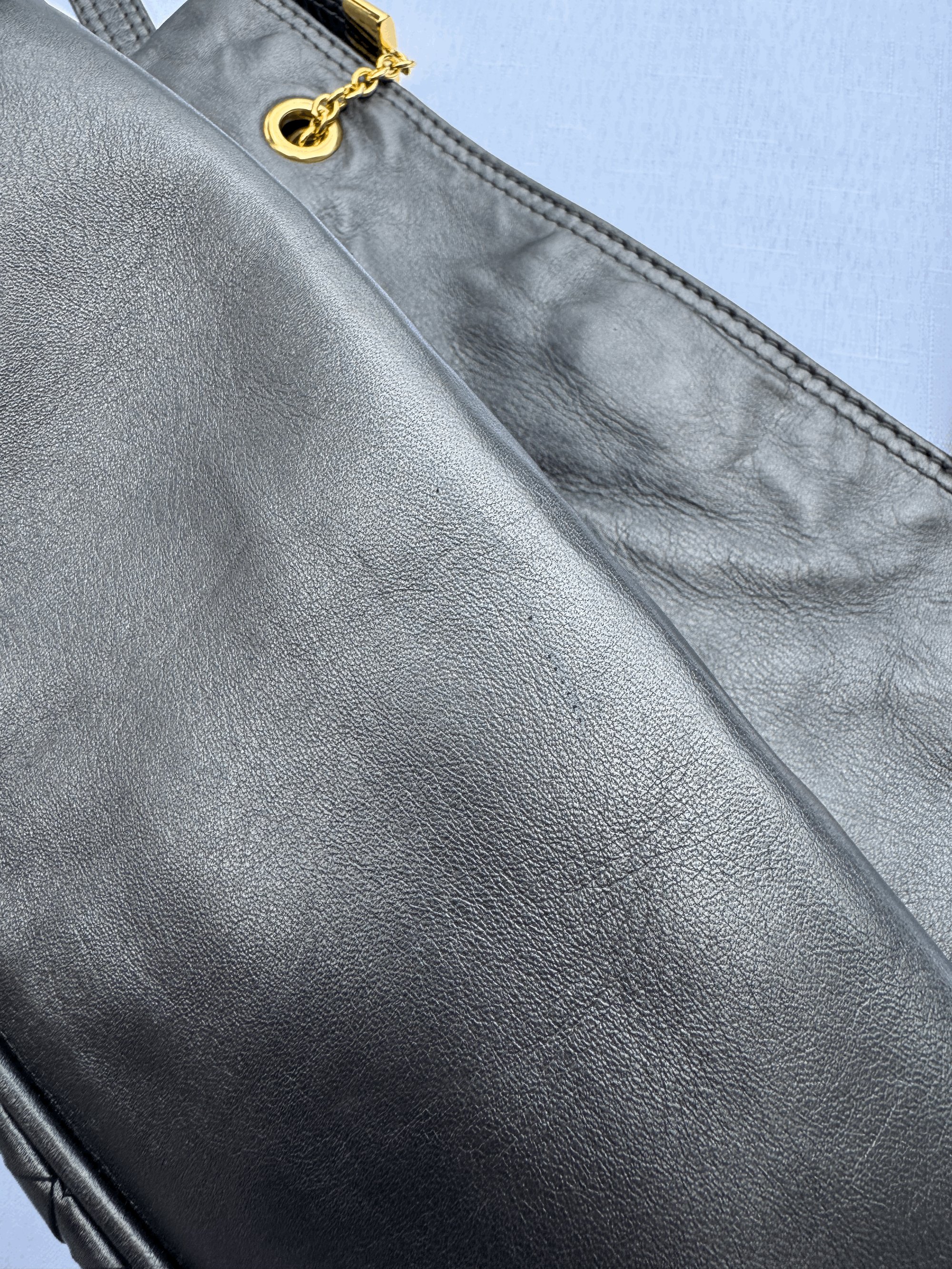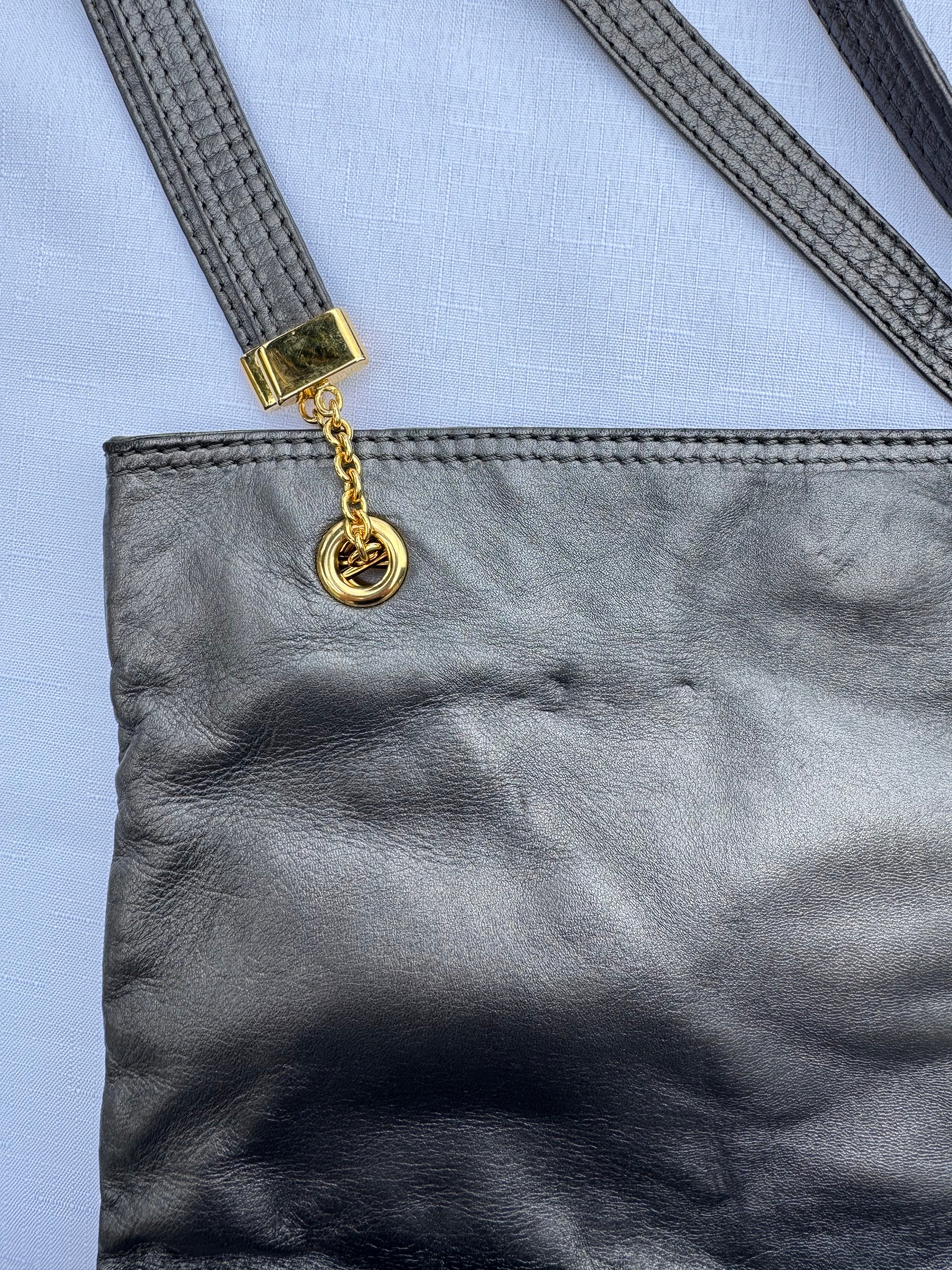 Material: Charcoal grey leather with gold hardware
